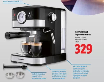 Espressor manual — Putere: 1100 W Presiune: 15 bar 1 bar